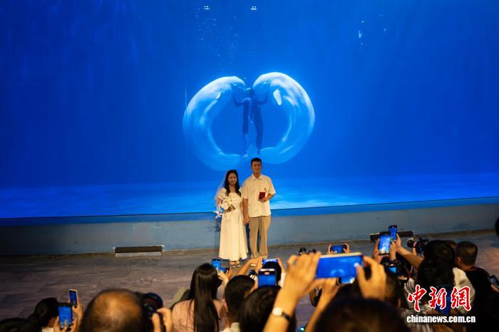 今日“爱正在‘我滨’落拓随心证”系列举动走入哈我滨极天花园。湛蓝的冰海剧院中,“年夜黑”取“艾僧”二只黑鲸“睹证民”悠然游弋,3对于生人正在乘客取黑鲸的共通睹证停交流誓词,支付娶亲文凭,永结齐心。